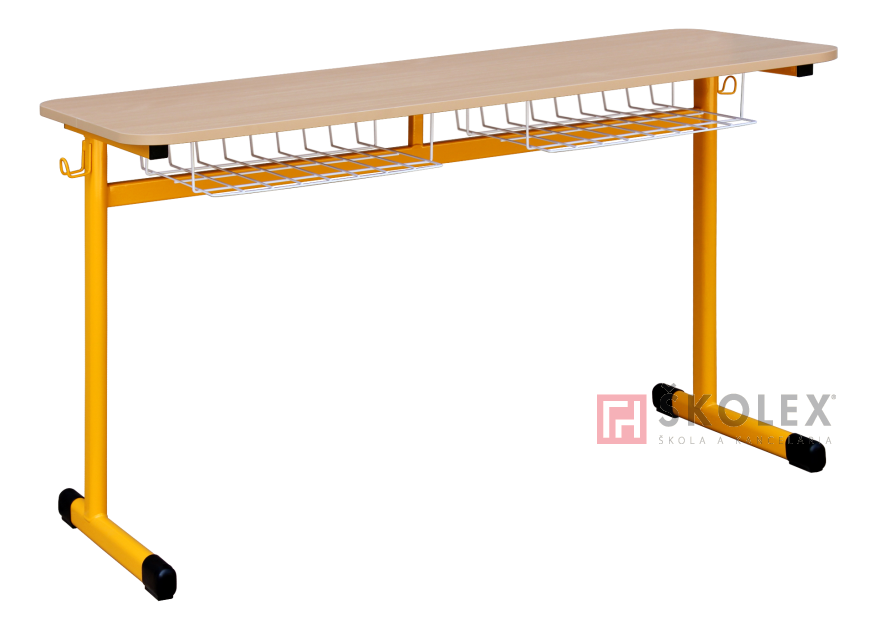 Kovová konštrukcia vysokej pevnosti vyrobená z plochooválneho profilu 50 x 30 mm, lakovaná práškovými farbami rôznych odtieňov, nohy sú ukončené plastovými koncovkami s veľkou trecou plochou, ktoré tlmia hluk a nepoškodzujú podlahu. Pracovná doska stola 130 x 50 cm je z drevotriesky hr.18 mm, povrch melamín - buk, (zaoblené hrany dosky R 70 mm) priskrutkovaná ku konštrukcii 4 metrickými skrutkami M6 (pomocou zalisovaných oceľových puzdier); hrany dosky stola sú chránené 2 mm ABS hranou. Odkladací priestor stola je riešený hygienickým drôteným košíkom (neusadzuje sa prach), lakovaný komaxitovou farbou, 2 vešiačiky na zavesenie tašiek. K školským stolom TITAN sú vhodné školské stoličky LAVA,SOKRATES, školská katedra LUX alebo UNO a učiteľské stoličky SOKRATES čalúnené.