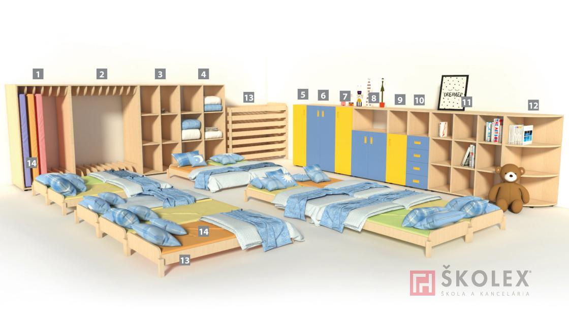Die Modelreihe der Möbel für die Kindergärten - NELI. Die Aufstellung Nr. 4 ist eine Funktionskombination des Raumes fürs Schlafen und des Laderaums für die Matratzen und fürs Bettzeug. Die Variabilität der Farbkomtination der Möbel, als auch der Zusammenstellung der einzelnen Möbelkomponenten ist selbstverständlich.
