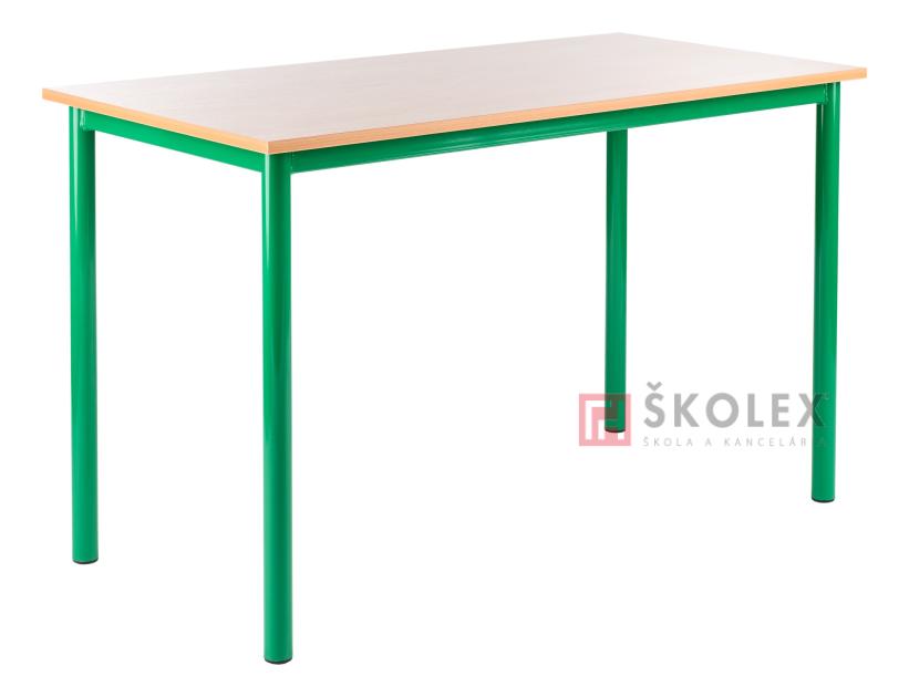 Rohrgestell D40 mm, pulverbeschitet in RAL, Beine mit Kunststoffendungen beendet. Tischplatte 18 cm dicke Holzspanplatte, ABS-Kante 2mm. (mehr)