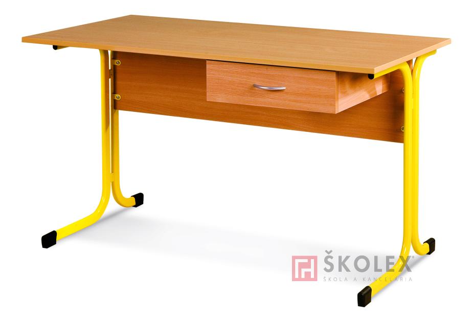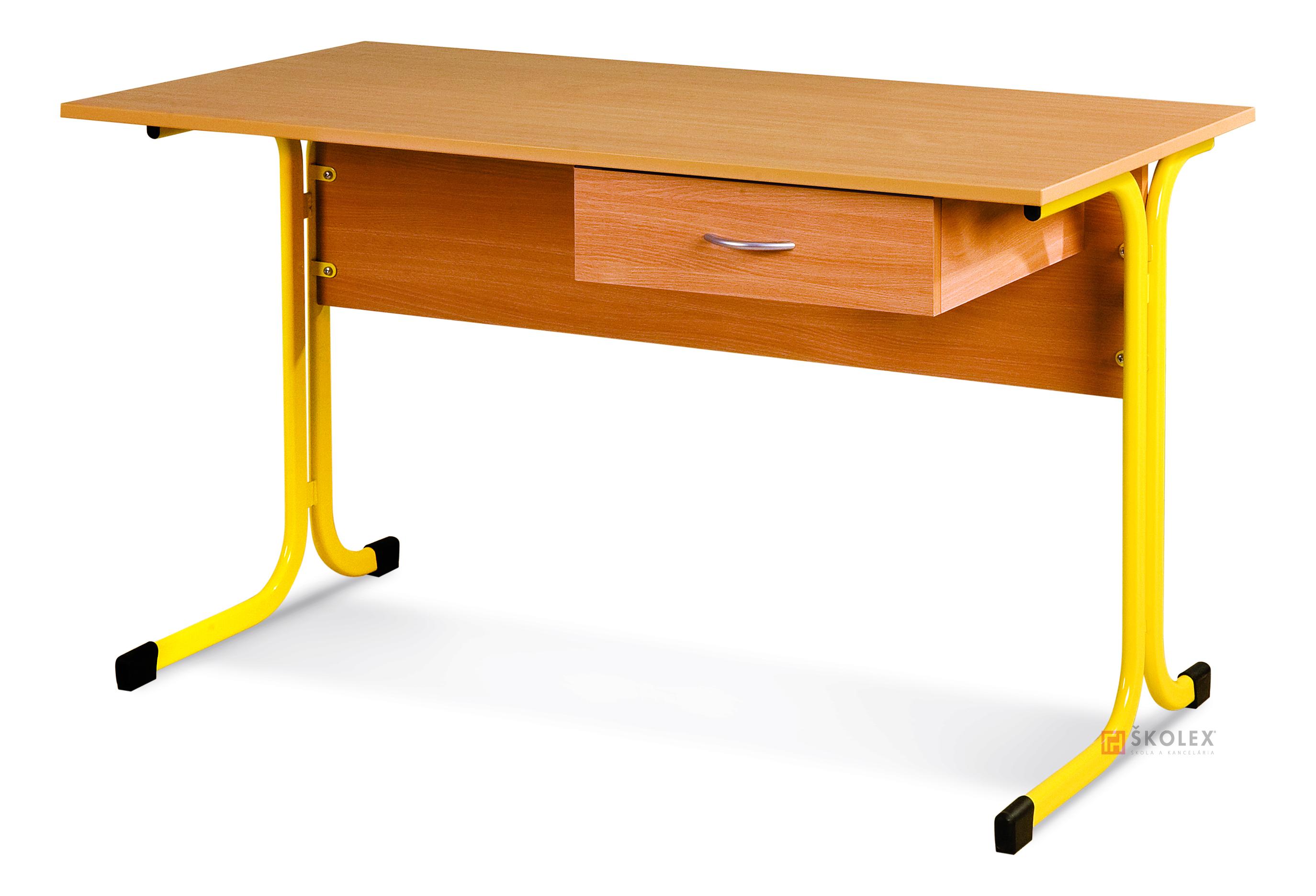 Metallkonstruktion hoher Festigkeit, hergestellt aus Flachovalprofil 38 x 20 mm, mit Pulverfarben verschiedener Töne lackiert (Auswahlmöglichkeiten aus 11 Farben). Die Beine sind mit Kunststoffendstücken mit einer großen Reibungsfläche versehen, die Lärm dämmen und den Boden nicht beschädigen. Die Arbeitsplatte des Tisches 130 x 65 cm und die vordere Schutzplatte 130 x 35 cm besteht aus einer 18 cm dicken Spanplatte, mit einer Oberflächenbeschichtung aus Melamin (Buche 381), und ist an die Konstruktion mit 4 metrischen Schrauben M6 befestigt; die Kanten der Tischplatte sind mit einer 2 mm dicken ABS-Kante geschützt. Die Ablage des Tisches ist als eine ausziehbare Schublade mit einer Breite von 40 cm an der rechten Tischseite ausgeführt. Zur Lehrkanzel LEGAL eignet sich der Lehrstuhl SOKRATES - gepolstert, der Schultisch LUX, CEZAR oder UNO und der Schulstuhl SOKRATES.