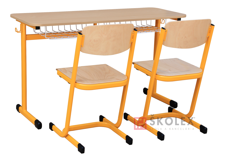 Tisch Titan, Ovalprofil 50x30mm + 2x Stuhl Lava, Ovalprofil 38x22mm, pulverbeschichtet (Wahl aus dem RAL-Musterblatt), Beine mit Kunststoffendungen ohne Filzeinsatz. Tisch mit Ablageraum (Gittekorb, weiße Farbe) und Taschenhaken, Holzspannplatte 18mm dick, mit ABS Kanten, Buche. Möglichkeit der Wahl anderer Tischplatten - BOND 19mm dick, mit HPL-Oberseite, Kante aus Buchenmassiv oder BISON 22mm dick, mit PUR Kanten. Stuhl mit dem Sitzträger (mit Knierolle) und der Rückenlehne aus Sperrholzplatte, beidseitig lackiert. Größe: 3, 4, 5, 6 (7).